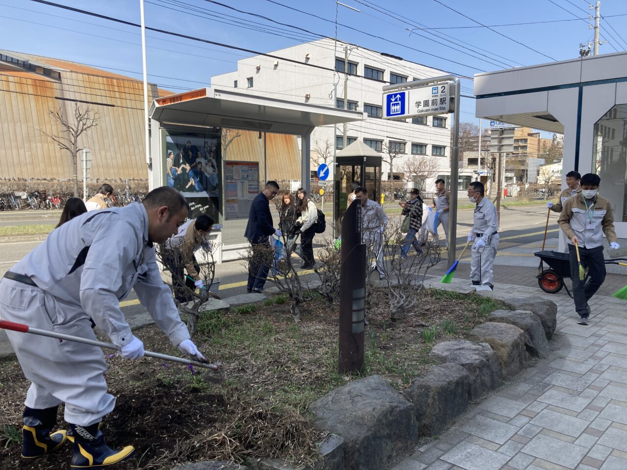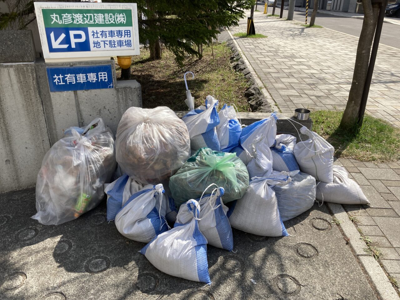 当社では冬季間、本社社屋に隣接する地下鉄学園前2番出口付近の転倒防止のための砂まきを実施しており、その砂を中心にゴミや落ち葉などの回収と札幌市の花壇の雑草除去も行いました。