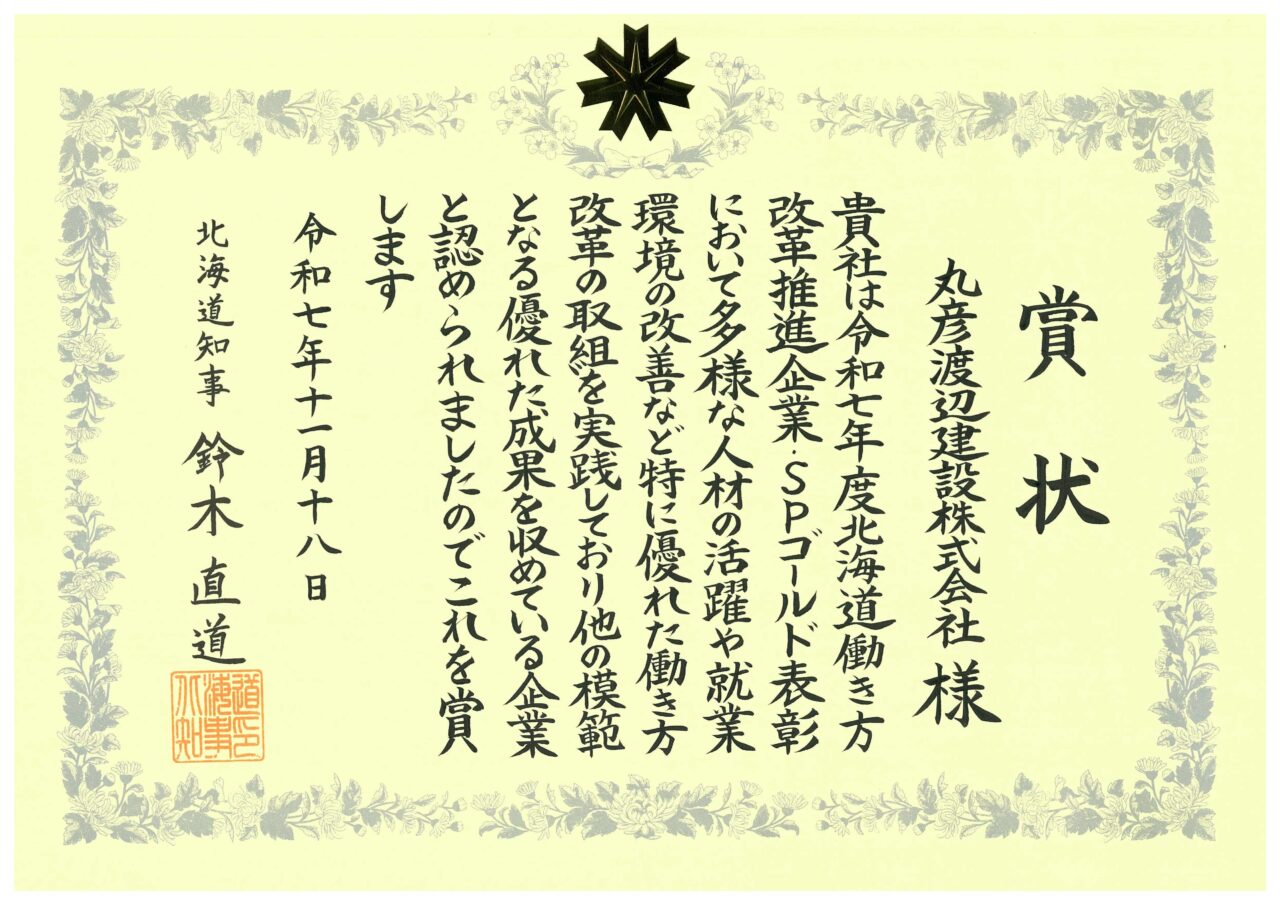 令和7年11月18日、北海道知事より「令和7年度北海道働き方改革推進企業・SPゴールド表彰」を受け