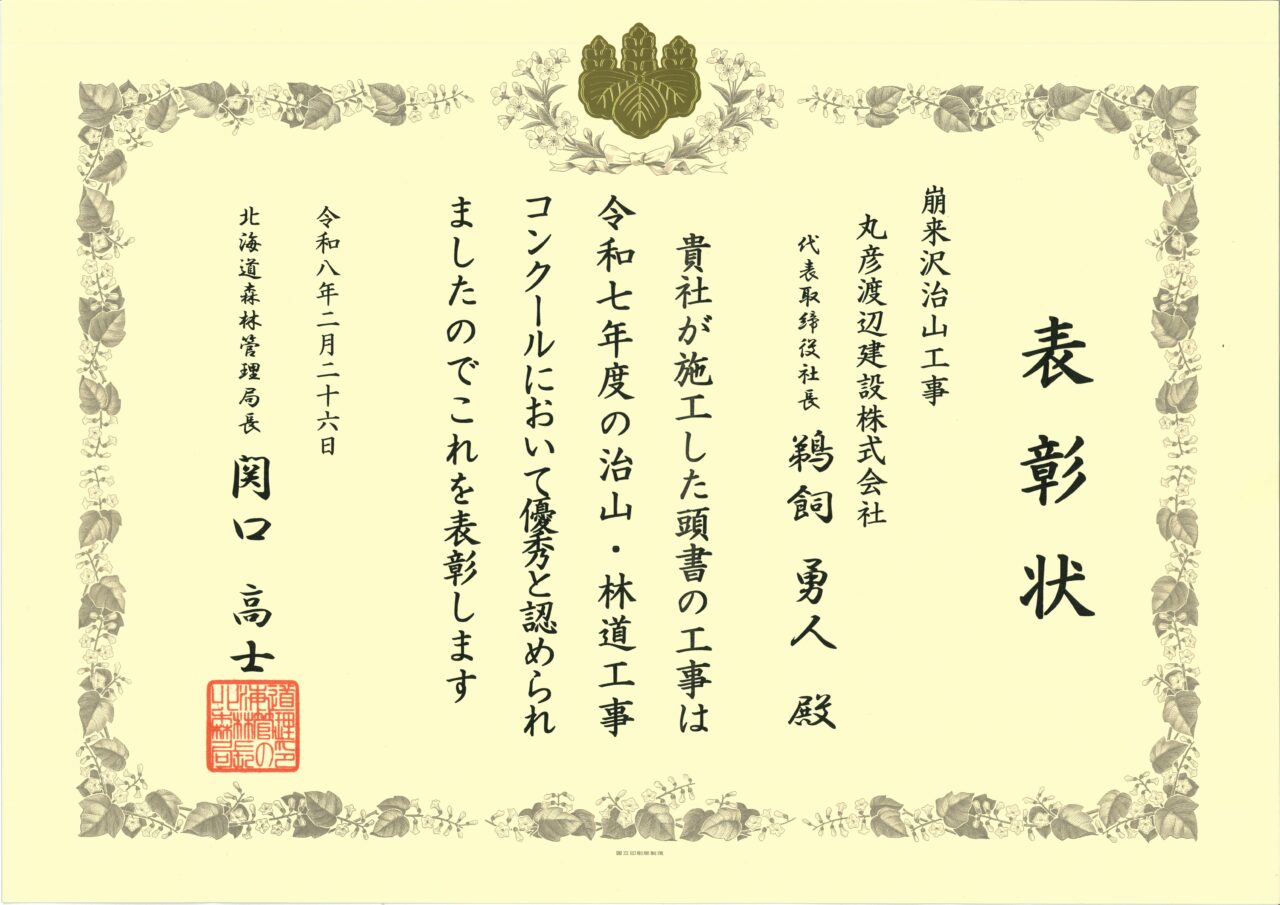 令和8年2月26日、新冠郡新冠町にて実施した治山工事が「治山・林道工事コンクール」において優秀賞を受賞し北海道森林管理局長の関口高士様より表彰状を頂きました。