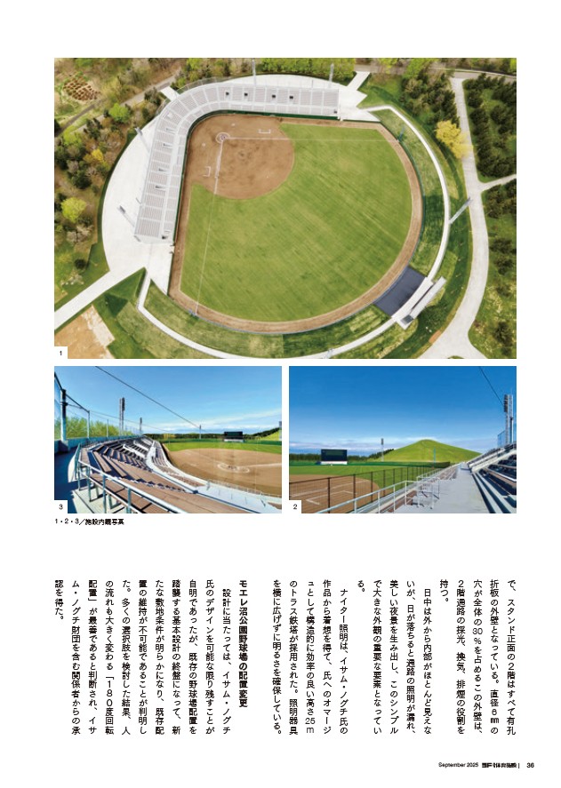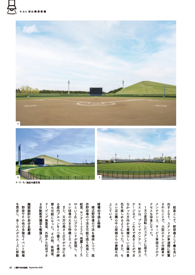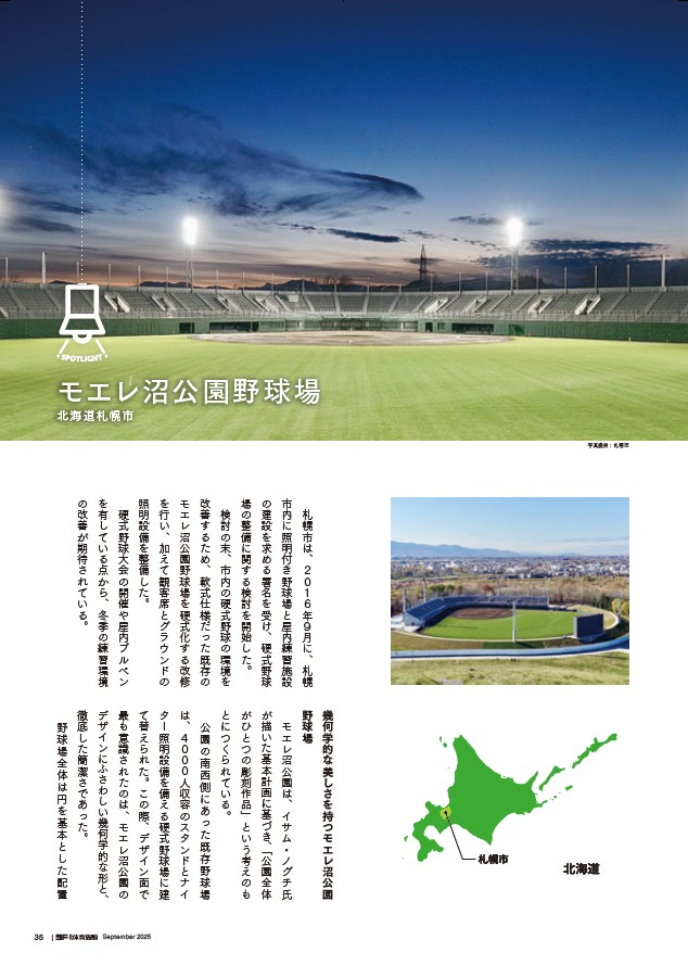 同誌では「SPOTLIGHT」特集として、軟式野球場から硬式野球場への建て替えプロジェクトの全容が詳しく解説されています。 モエレ沼公園の設計者であるイサム・ノグチ氏のデザイン思想を尊重した「幾何学的な美しさ」を持つスタンド形状や、180度回転配置による景観と機能性の向上など、本施設の建築的な特徴が多くの写真とともに掲載されています。