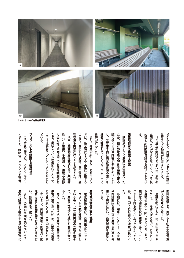 記事内では、かつての廃棄物埋立地という特殊な敷地条件における基礎工事の工夫や、複雑な形状を持つコンクリート打放し仕上げの施工品質管理など、当社の施工技術についても触れられています。