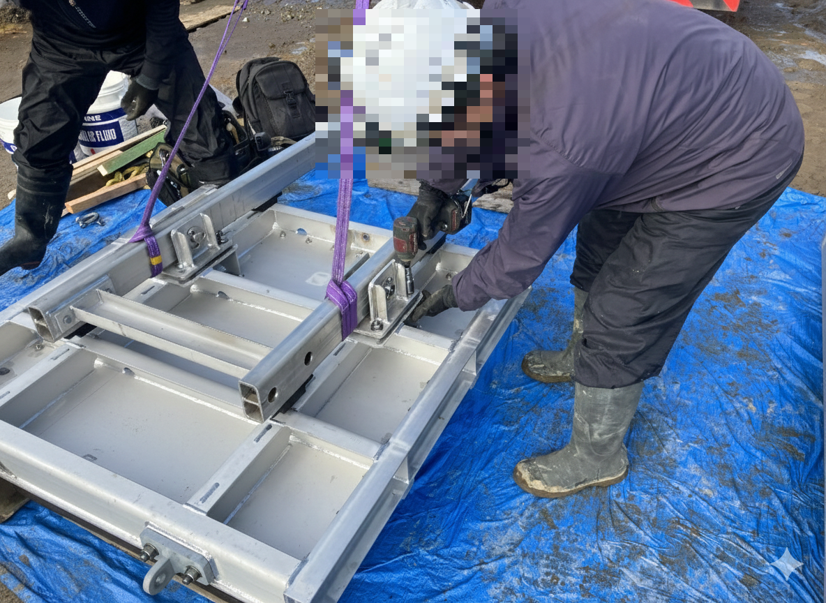 クレーンを使用して戸当りを所定の位置に配置します!