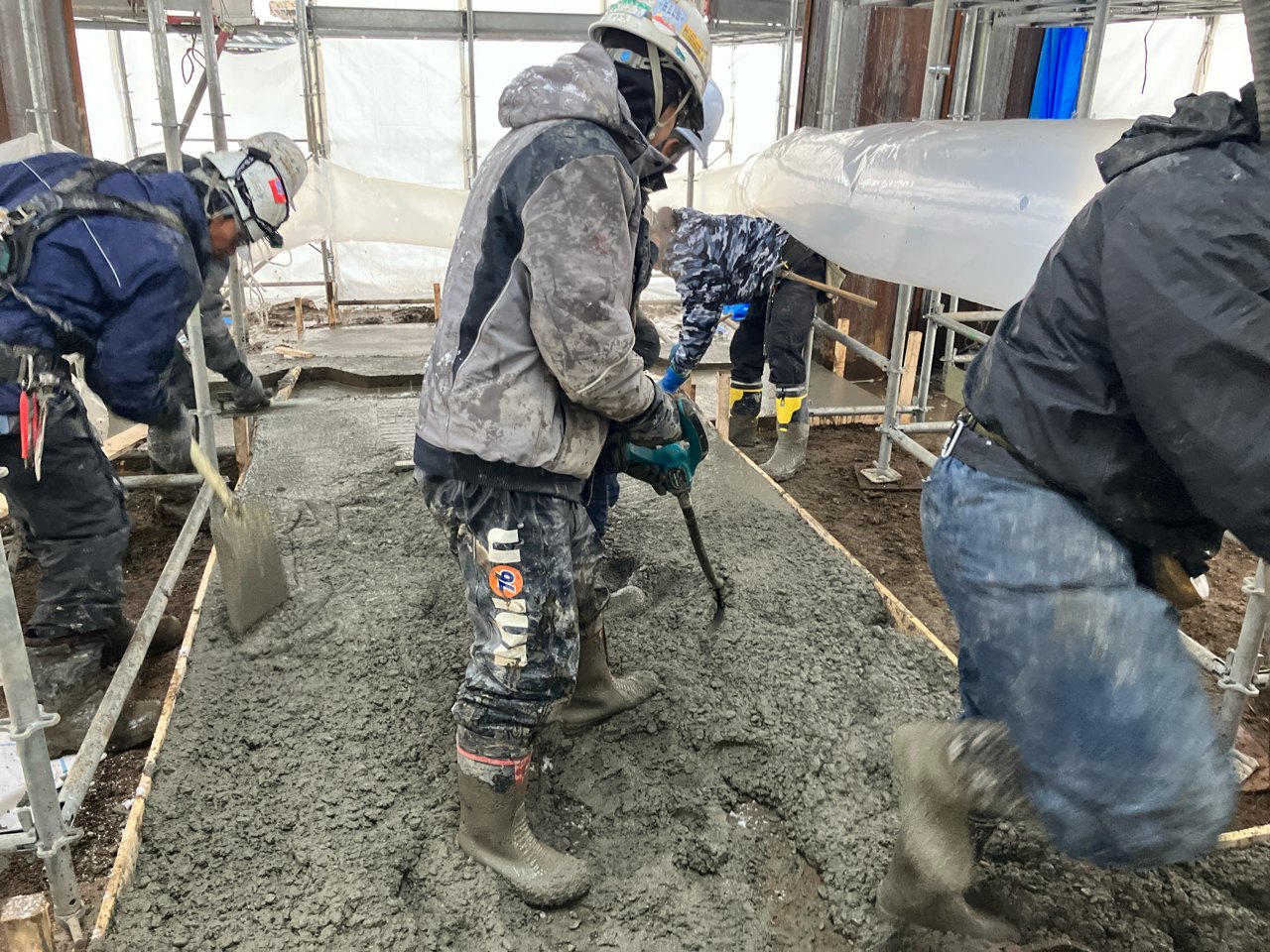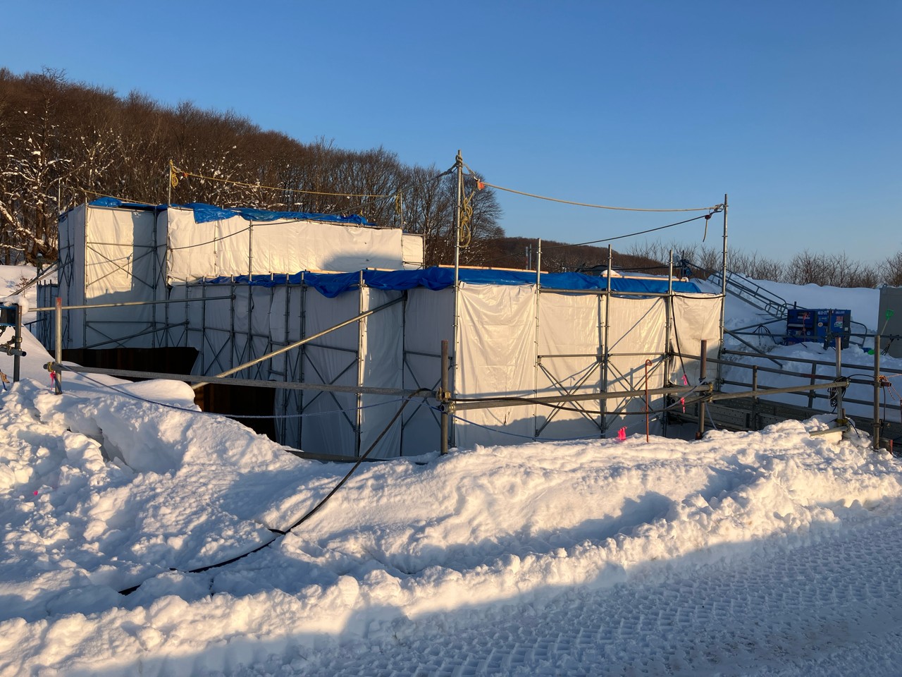 北海道の厳しい寒さや雪からコンクリートを守るため、足場を組んでからシートで覆います!!