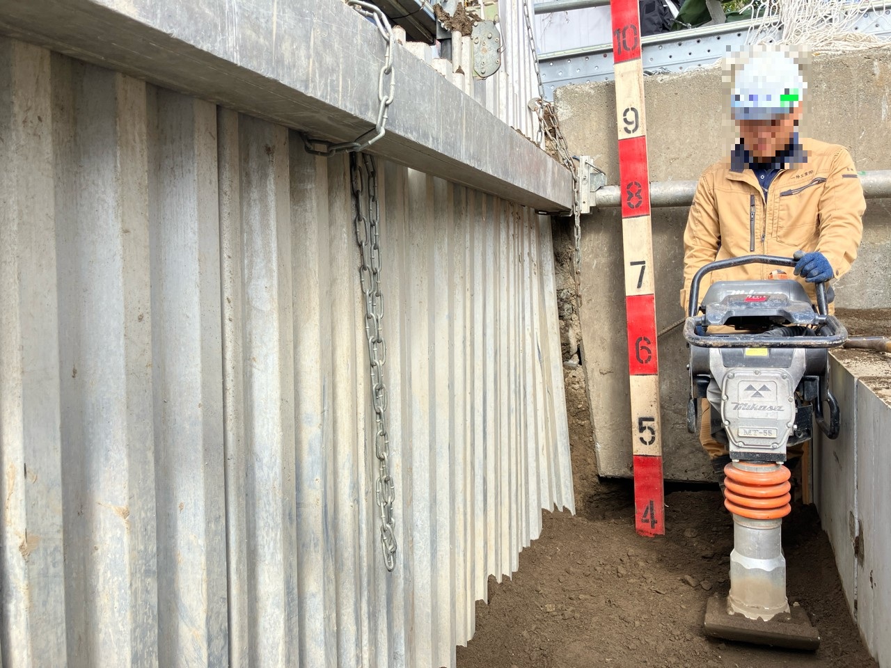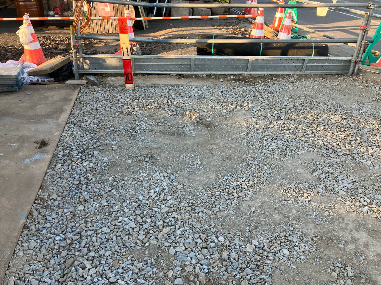 撤去が完了したら地下排水構造物を支えるための鋼管杭を打設するため、一旦埋戻しをして地面と平らにします。