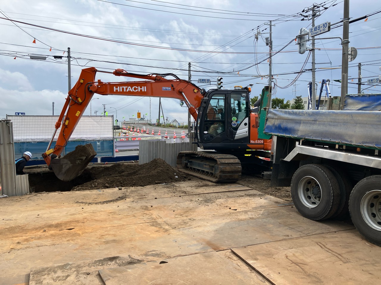鋼管杭の打込みが全て終わったら、基礎コンクリートを打設するため、所定の深さまで慎重に掘り進めて行きます。
