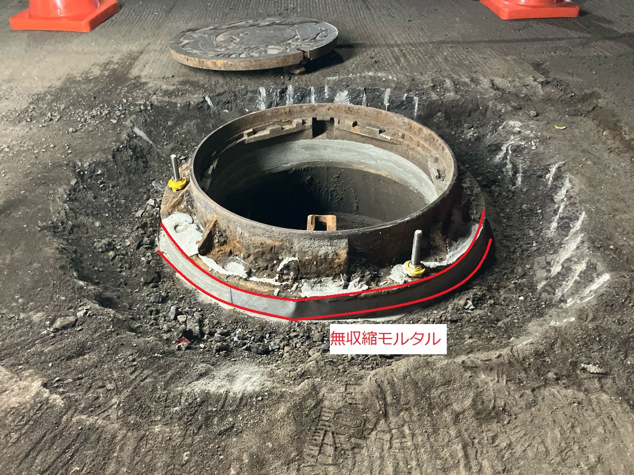調整リングの設置が完了したので、受枠調整リングの間にトロトロにした無収縮モルタルを流し込んで打設していきます!!