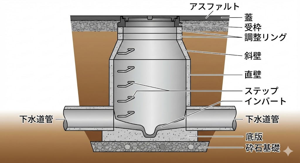 マンホールの構造は下の図のようになっていて、大まかな高さ調整は調整リングで行い、細かい調整は無収縮モルタルというもので行います!!